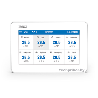- контроль и изменение температуры воздуха максимально в 32-х помещениях (в случае последовательного подключения 4-х контроллеров TECH L-9);